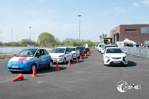 Nachdem wir unsere Rundstrecken gefahren waren, ging es mit allen Fahrzeugen zum Ausweich-Parkour. Als erstes schnappten wir uns den Tesla. Ziel Geschwindigkeit vor der Wasserbarrieren, 50 km/h. Gar nicht so einfach. Ich schoss über das Ziel hinaus und drehte sodann auch eine Pirouette. Im dritten Anlauf klappte es dann mit dem umfahren und nicht dem um Fahren. Auch Sascha hatte so seine Last mit dem Tesla, steuerte ihn ab gut durch das erste und um das zweite Hindernis.